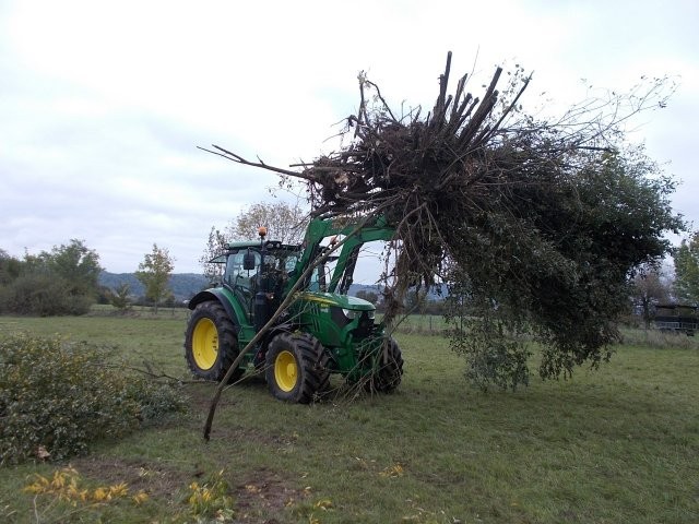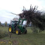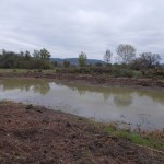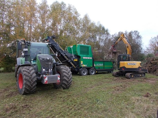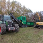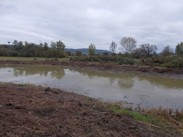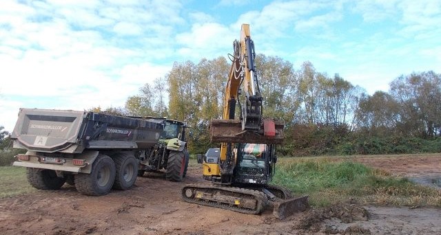 Die Maßnahmen. „Zunächst musste die Baustelle eingerichtet werden. Das heißt, das von uns beauftragte Tiefbauunternehmen organisierte schweres Gerät wie Bagger, Traktoren mit Anhängern und LKW zum Ab-transport des Erdmaterials. Danach ging es an die Entfernung des Weiden-gürtels und anderer Gehölze, die schon vor Ort für die Kompostierung in einem beeindruckenden Prozess geschreddert wurden. Der nächste Schritt sah die Entnahme des Wurzelwerks aus den Uferbereichen vor, um ein schnelles Wiederaustreiben der Weiden zu verhindern. Danach ent-schlammte und entkrautete der versierte Baggerführer vorsichtig den circa 1.200 m² großen Tümpel. Anschließend flachten wir die Ufer ab und stell-ten die Flachwasserzonen wieder her. Und gestern beseitigten wir die Flurschäden, die im umliegenden Grünland entstanden sind, das sich schnell wieder begrünen soll.“, berichtet Hufmann.