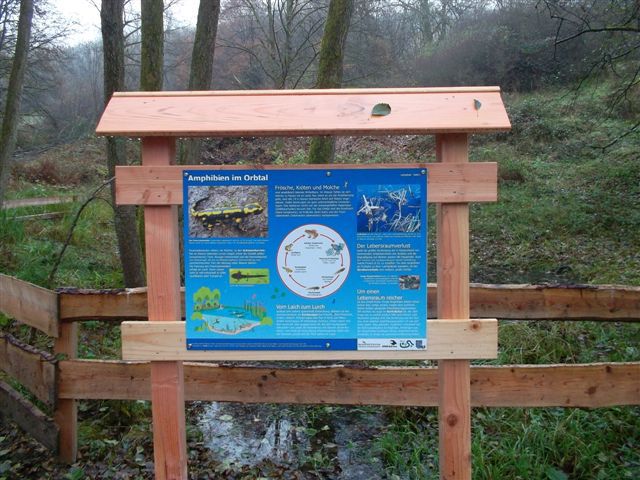 Nach der Neuanlage von Tümpeln entwarfen wir im Auftrag der Natur- und Vogelschutzgruppe Bad Orb einen kleinen Lehrpfad für das gut besuchte Orbtal mit den Themen „Waldtümpel im Orbtal“ und „Amphibien im Orbtal“. Zur Zielgrupppe zählen neben den zahlreichen Kurgästen auch Spaziergänger, Wanderer und Naturinteressierte.