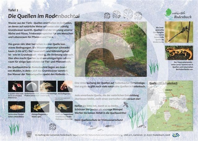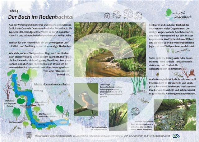 Im Auftrag der Gemeinde Rodenbach statteten wir den Wanderweg mit attraktiven Informationstafeln (4) aus. Spaziergänger, Wanderer und andere Naturliebhaber erhalten Informationen über das Rodenbachtal, die Quellen, den Bachauenwald und das Gewässer.