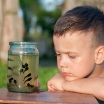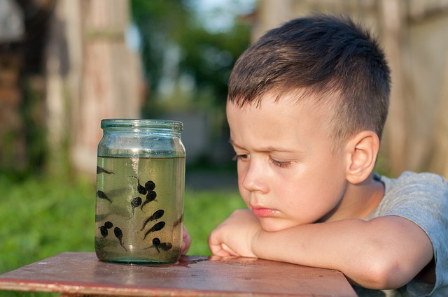 Suche nach Kaulquappen von Fröschen und Kröten am See.