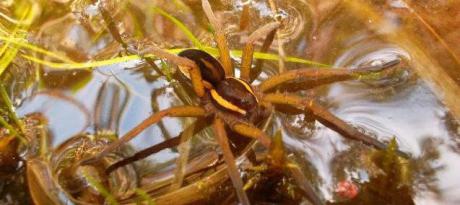 Auch die Spinne des Jahres 2020, die Gerandete Jagdspinne ist im Eschenkar zu Hause. Im Verlauf der Jahre ergänzten viele Maßnahmen die Renaturierung: Anlage weiterer Amphibientümpel, „Entfichtung" des Umfeldes, Einbau der Wurzelteller als zusätzliche Lebensraumstrukturen, Sonnenplätze und wintersichere Quartiere für die vom Aussterben bedrohte Kreuzotter und andere Reptilien wie Schlingnattern und Co.